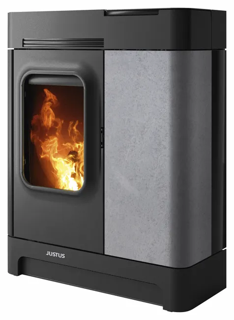 Estufa de pellets de acero negro y piedra esteatita con convección natural de 8 kW que ofrece autonomía (depósito de 19 kg) y funcionamiento silencioso, además de contar con WIFI de serie.